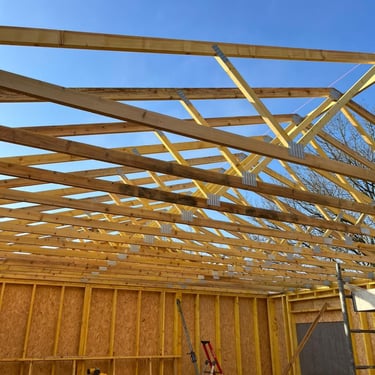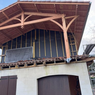 Taillage de la ferme à l'atelier, pose le la ferme sur poteaux et création d'un toit terrasse.