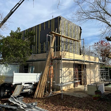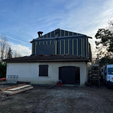 Puis bardage, pose des menuiseries, et de la zinguerie.