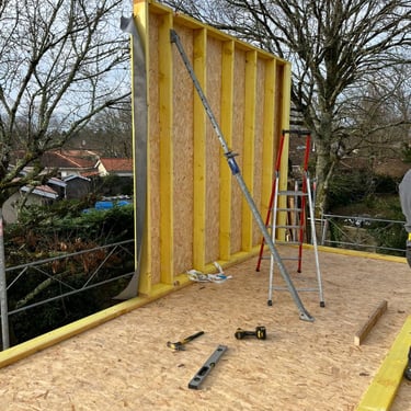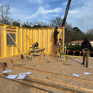Ensuite nous posons les murs ossature bois, la charpente en fermette.
