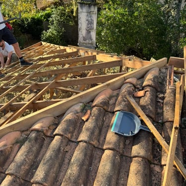Début du chantier, nous commençons par la démolition de la toiture, charpente, cheminée et nous sécurisons les plafonds.